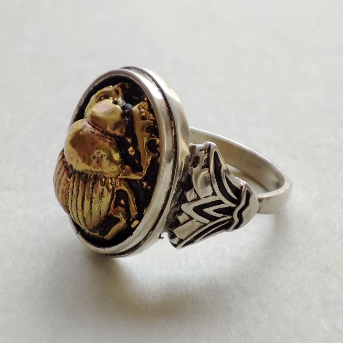 正面にはスカラベ、両側に蓮のモチーフをあしらったリングです。
