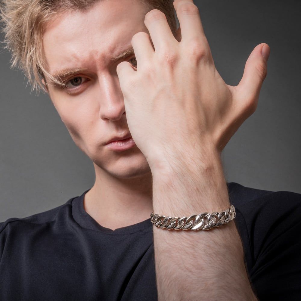 This sterling-silver curb bracelet graduates subtly from 10 to 15 mm, so light flows across the links in a smooth, architectural rhythm. Each link is engraved with arabesque flourishes, while a three-dimensional rose crowns the lobster clasp—function and beauty resolved in a single gesture. Mirror-polished planes play against softly oxidized recesses to deepen the relief and amplify silver’s natural luster. Edges are chamfered and the underside is finely finished for lasting comfort and a confident, well-balanced weight on the arm.