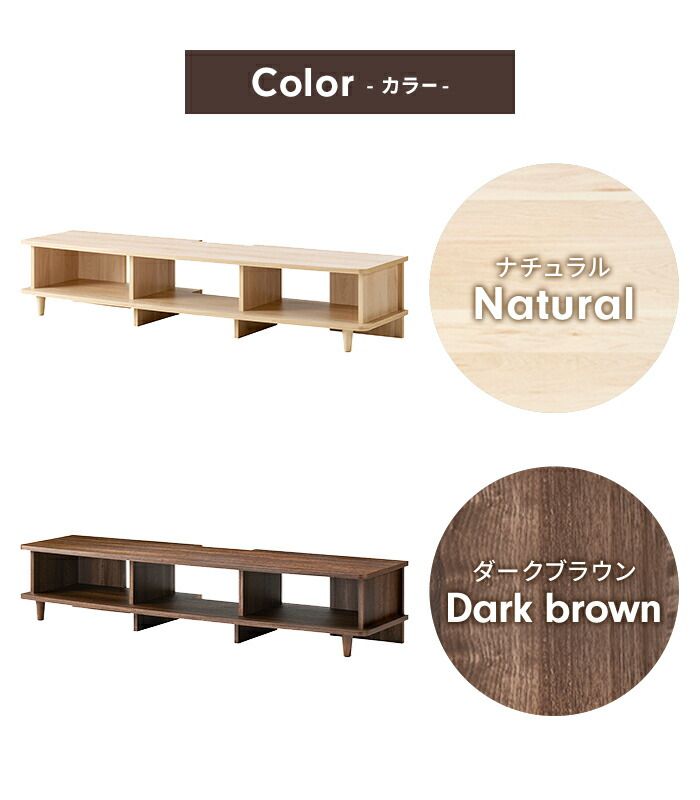 ナチュラルな木目調がおしゃれなローボード。圧迫感を与えないオープン棚でお部屋を広く見せるデザインです。天板は安心の耐荷重50kgで大型テレビも設置可能。北欧テイストの丸みある天板と脚部がやさしい雰囲気を演出します。背板のないオープンタイプだから機器の熱がこもりにくく、配線もスムーズ。シンプルでどんなインテリアにも自然に馴染みます。