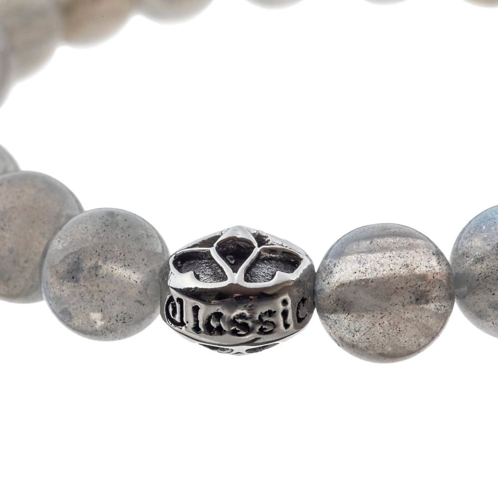 天然ラブラドライトの数珠ブレスレット。光の当たり方や角度により、灰色、青色、黄色等さまざまな色彩の輝きを放つ。トレサリーとブランドロゴをデザインした金属パーツがブランド感を演出。※天然石を使用しているため、1石ごとに個体差がございますのでご了承ください。