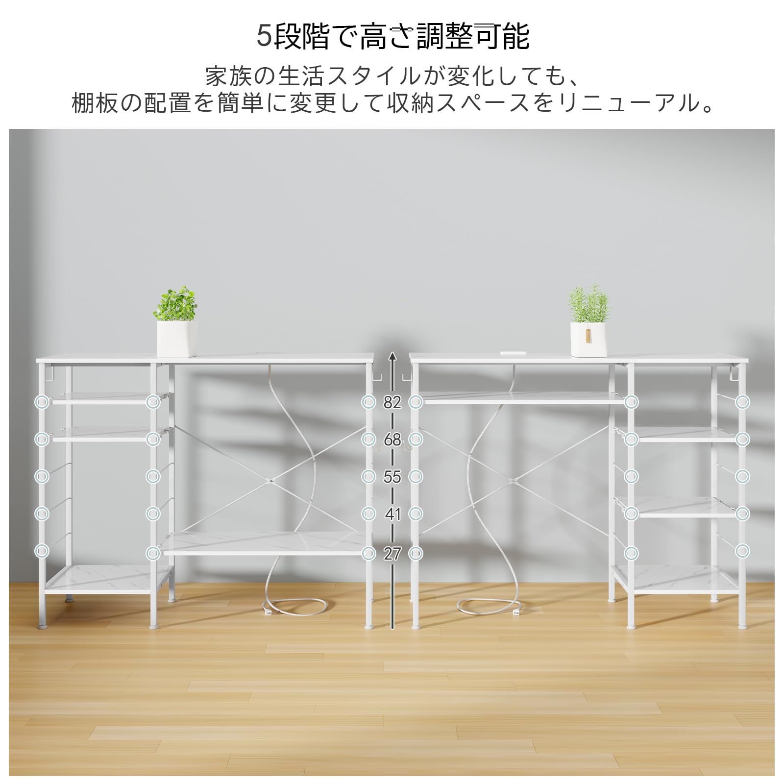【安全構造】背面に設けられたクロスバーがラック全体の剛性を高め、横揺れに強い頑丈な構造を実現しています。日常的な使用でもがたつきが少なく、安全性を確保します。水や汚れに強いです。また、コンセントが付属しているため、小型家電を天板に置いてそのまま使用でき、配線も整理できます。
