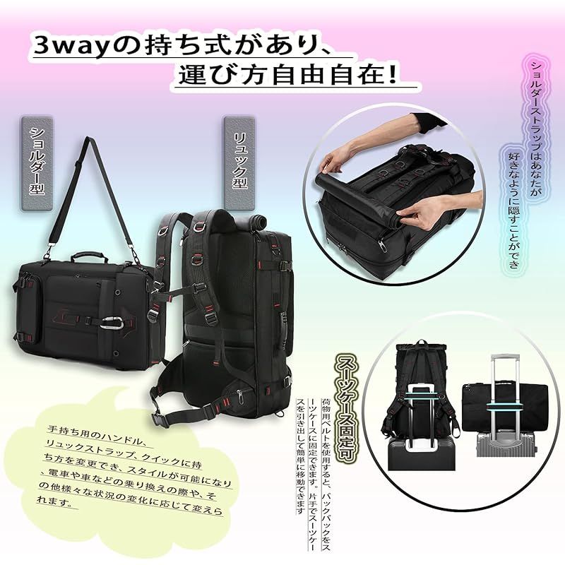 【多機能】3WAYバックパック:ショルダー型、手提げ型、リュック型へ変更可能です、出張通学旅行など様々なシーンに合わせてご活用いただけます。登山防水バッグ は品質を守りのため、 全体はSBSファスナー採用しています。ラップからサイドポッケトまでのテープを付属するので、盗難を防止し、ショルダーベルト部分にはサングラス等を引っ掛けられるDカン付き、携帯ライト、折り畳み傘、鍵などの小物の収納には便利です。外部USBポート。