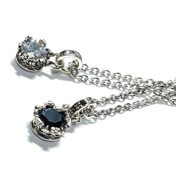 王冠の中にクリアキュービックを抱いた、キュートさと気品を併せ持つペンダント。クラウンの面にはクロス、フラワー、フレアーデリスを巧みに織り込み、ミルと透かしで立体感を演出。随所に散りばめたストーンが繊細にきらめき、鏡面の艶と燻しの陰影がモチーフに奥行きを与えます。小ぶりでも存在感は十分で、Tシャツからドレスまで幅広くマッチ。熟練の彫り込みと精密な石留めはACならではのクオリティです。石はまばゆいクリアとシックなブラックの2バリエーションを用意。色違いのペア使いや重ね付けでのコーディネートもおすすめ。ギフトにも最適な、長く愛せる一本。