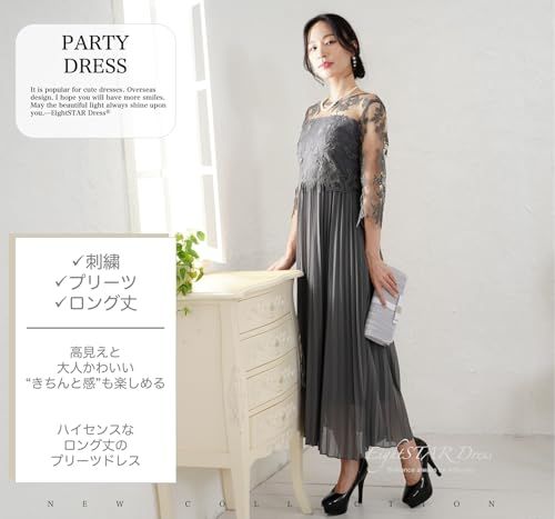 EightSTAR Dress パーティードレス ロング丈 結婚式ドレス 袖あり 刺繍 プリーツ お呼ばれドレス フォーマルドレス 大人 Aライン レース ゲスト 20代 30代 40代 JP アルファベット L ダークグレー