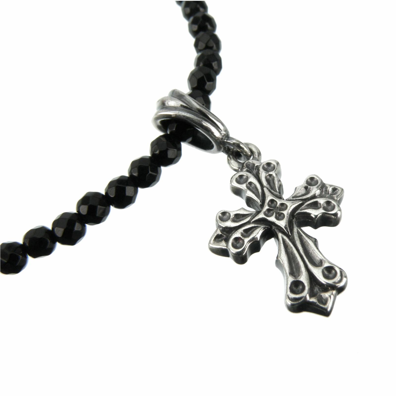漆黒のきらめきを連ねたカットオニキスに、ミニクロスが気高く揺れるペンダント。クロスは片面にクリアキュービックを端正にセッティングし、細やかなミル打ちの縁取りが光を美しく集約。もう片面はトレサリーのレリーフで陰影を描き、モードとクラシックの二面性を一つに宿します。気分や装いで表裏を切り替えられるリバーシブル仕様。