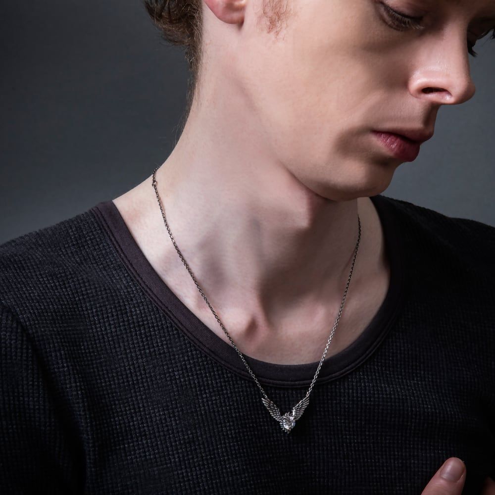 天使の翼をモチーフにした端正なフォルムに、クローがストーンを掴むようにセッティングされたユニークな一本です。羽根の一枚一枚まで緻密に彫り込まれた造形は、光と影を巧みに操り、まるで生きた翼が胸元に舞い降りたかのような存在感を放ちます。煌めくストーンは、クローの力強さと翼の優雅さを同時に映し出し、装う人の胸元に気品ある輝きを添えます。トップとチェーンを結ぶ吊り金具は、あえてシンプルに仕立てることで、デザインそのものの完成度を際立たせています。裏面にはブランドロゴと〈925〉の刻印が静かに光り、確かなクオリティの証を刻んでいます。アトリエ工房で熟練の職人が一点ずつ仕立て上げた本作は、職人技の結晶。ジュエリーのような存在感を宿しながらも、ファッションとしての軽やかさを併せ持つ、まさにアートピース。