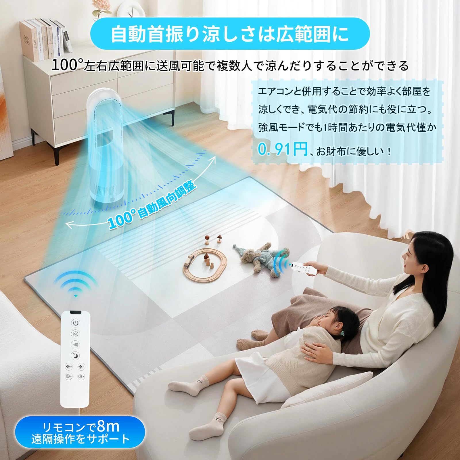 扇風機 羽根なし タワーファン【2024アップグレード・節電対策】DCモーター 省エネ 節電 8段階風量調整 微風&強風モード 100°自動首振り 9時間タイマー設定 静音 羽なし扇風機 大風量 リモコン遠隔操作 リビング扇風機 サーキュレーター スリム タワ