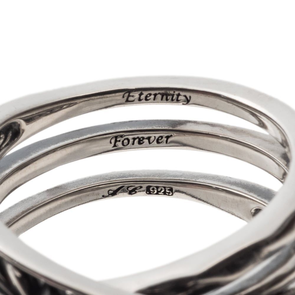 A uniquely interlinked three-wrap design themed around eternity. The trio of contrasting bands—plain, hammered, and openwork arabesque scroll—offers different expressions from every angle. Inside, the words “Eternity” and “Forever” are engraved, making it a meaningful choice for couples. Understated yet substantial, its balanced volume flatters the hand without feeling flashy. Unisex and ideal as a matching pair.