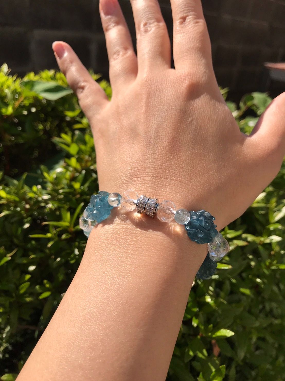 とても濃い深いブルーの高品質アクアマリンの丁寧な手彫りのお花のルースにアイスブルーのブルートパーズ、キラキラスターカットの水晶ロンデルを使ったデザインブレスレットです。