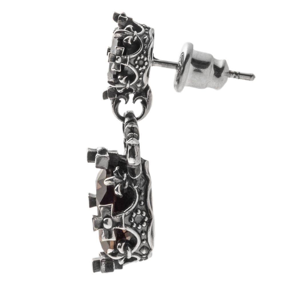 A miniature stage set at the ear. This double-drop stud pairs a deep CZ Black above with a smoky quartz below, linked by a fine chain that catches the light and sways with effortless grace. Crown-inspired bezels, delicate granulation, and filigreed arabesques sculpt rich shadows and sparkle from every angle. Each prong and seat is carefully refined, while the reverse reveals a tracery motif with a crisp brand signature and “925” quality mark. Crafted in sterling silver, the mirror-polished surfaces and subtle antiquing heighten the gemstones’ color, creating a piece that slips seamlessly from modern to classic styling. Wear it solo, or layer with other crown-themed jewels for a considered, unisex look.