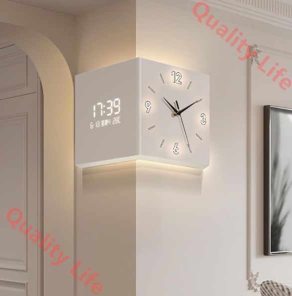 両面時計 角時計 デジタル時計 リビング 時計 壁掛け センサースイッチグロー明るいデジタルコーナー壁掛け時計 と温度と湿度表示を搭載 ホームクリエイティブデコレーション振り子時計 多機能西海岸スタイルファッショ クリームホワイト