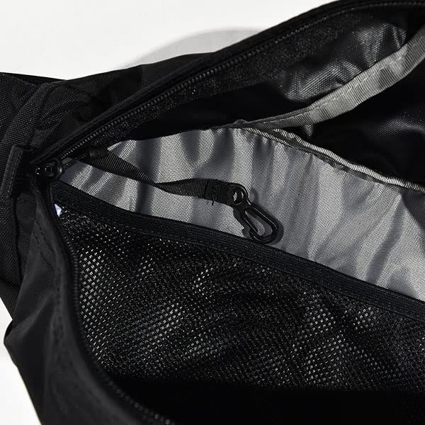 内側にメッシュディバイダーとキークリップつき/背面にファスナーポケット/ウエストのウェビングテープは片引きタイプ