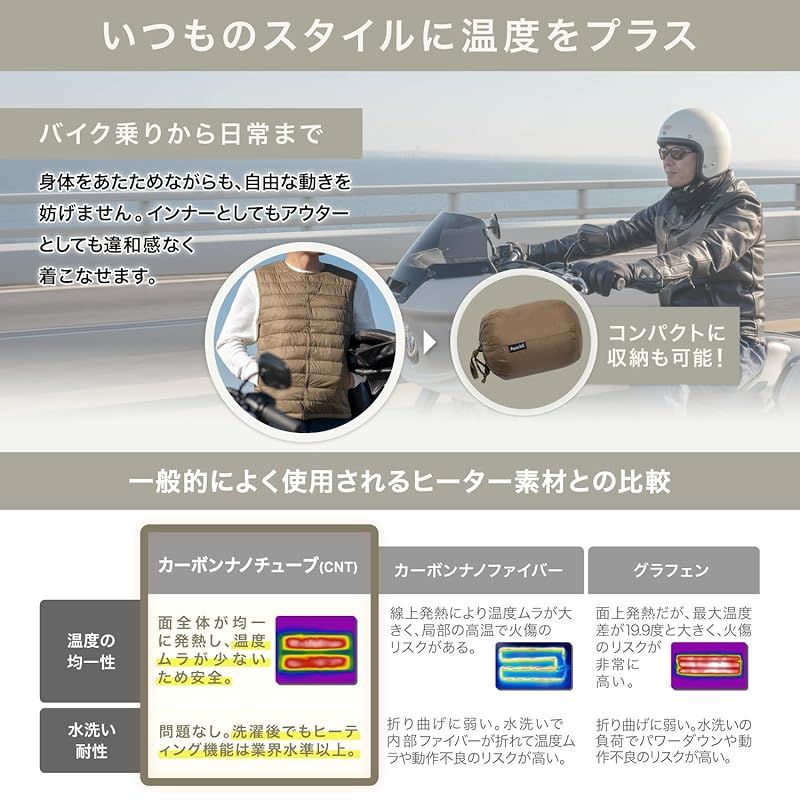 【シンプルで使いやすく、こだわりのデザイン】電熱ベストはアウターなどの中に着込む事でその効果を最大限発揮します。その為、中に着込みやすいように襟なしのスッキリとしたデザイン。ベストに搭載されている温度調整ボタンも、右後ろの裾部分に取り付けられているので目立ちづらく押しやすいです。温度調整ボタンのLEDは調整時のみ一瞬光るだけで常時点灯はしないので目立ちません。