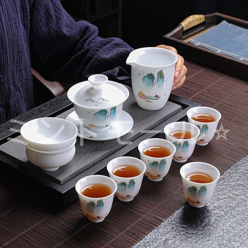 高山流水 手描き 羊脂玉磁器 光沢仕上げ 茶器11点セット プレゼント 茶器セット 急須セット 日本茶セット 茶具 ギフト 工