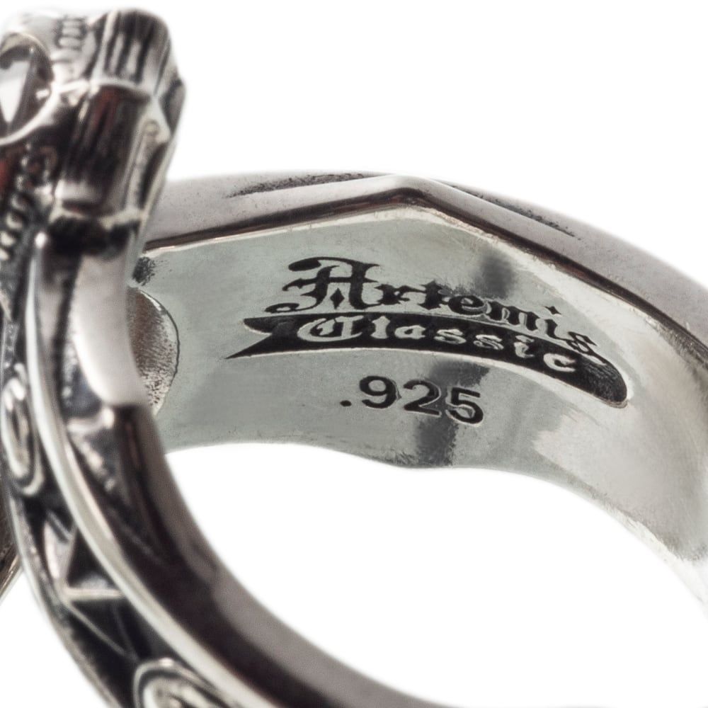 ゴールドの輝きを纏ったスマイルモチーフが印象的に輝く〈スマイル&スターリング〉。銀のベースに18金コーティングを施したスマイルフェイスは、ポジティブなエネルギーを象徴し、指先に遊び心と上質感を同時に宿します。アームには星とスマイルが交互に彫り込まれ、夜空に瞬く星々のようにリズミカルな装飾を描出。さらに、裏面にはトレサリー調のピースマークを刻み込み、アートピースとしての深みを添えています。煌めくジルコニアをセットしたディテールが光を受けるたびに鮮やかな輝きを放ち、シルバーの燻し仕上げと絶妙なコントラストを奏でます。ブランドの証としてアーム裏に刻まれた925刻印とホールマークスタンプが確かな品質を物語り、職人の手仕事による造形美をより際立たせています。可愛らしさと気品を兼ね備えたデザインは、大切な人への贈り物としても最適。