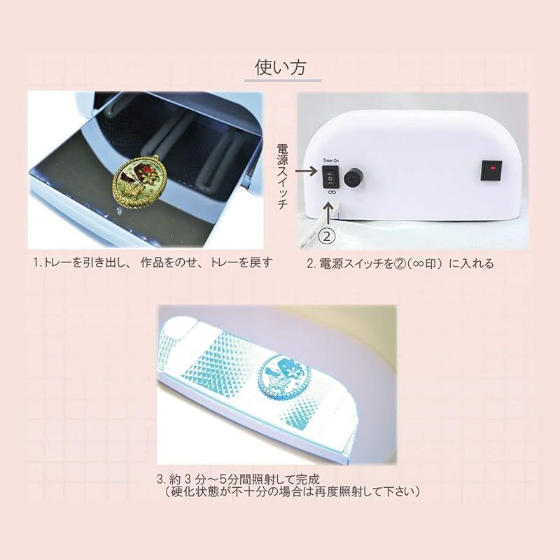 UVで硬化するレジン液に対応したランプです。36Wタイプです。便利なタイマー機能(約2分)搭載です。天候・環境に左右されず、安定した硬化時間で作品を制作することができます。底面がスライド式になっており、作品の出し入れに便利です。