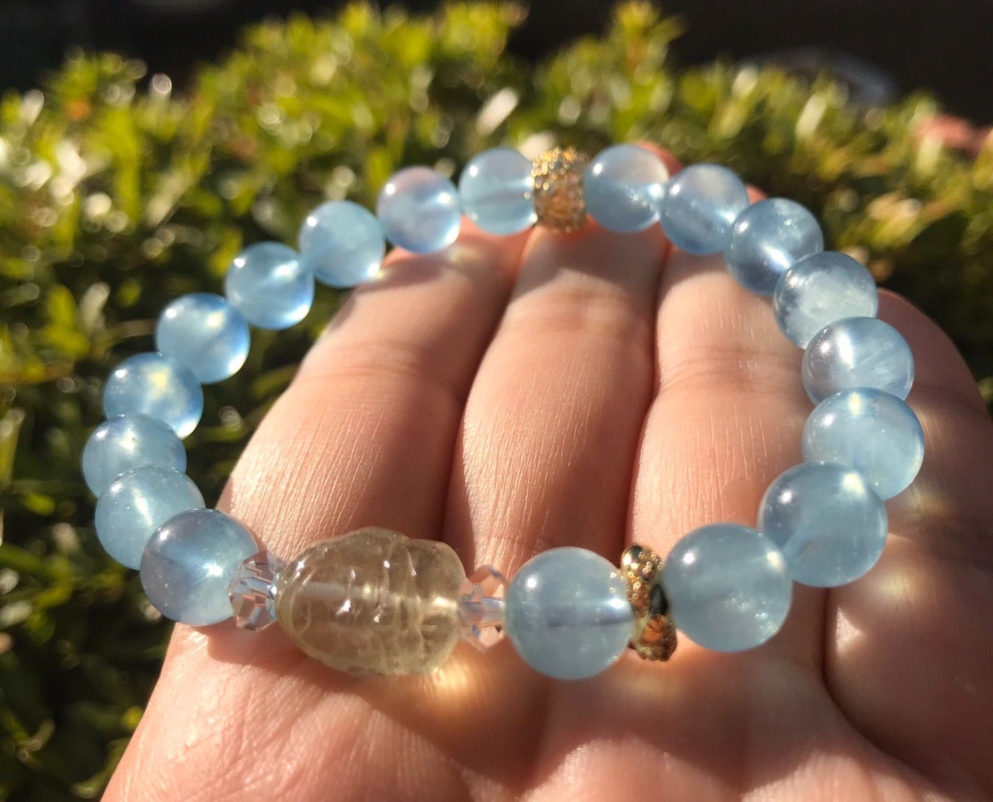 透明度の高い高品質リビアングラスのレアな手彫りガネーシャ神のビーズとアクアマリンのデザインブレスレットです。