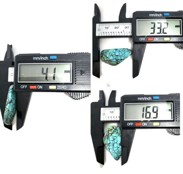 材質:チャイニーズターコイズサイズ:画像のノギスにて確認ください。重さ20.6ct黒い細かなウエブ模様の入った石です。石というのは、1点物です。沢山あるようで、石は出会い。同じ石はありません。お気に入りが見つかったらお早目に決断ください。