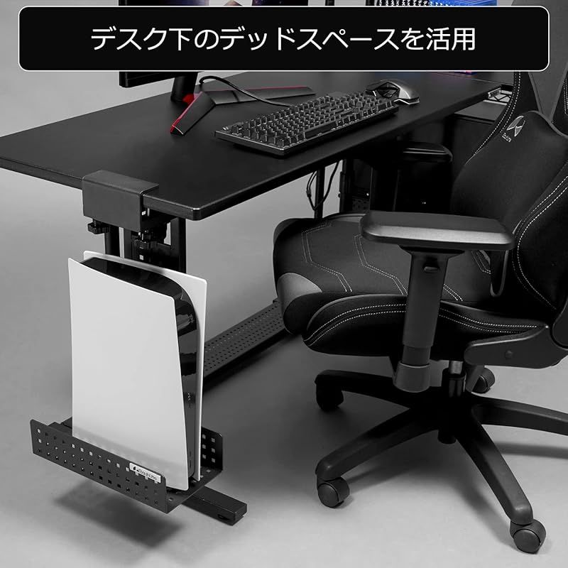 【デッドスペースを活用】最新の大型ゲーム機をデスク下に収納できるゲーム機専用ラックです。デスクの天板にクランプでしっかり固定して、お気に入りのハードを機能的かつスタイリッシュに配置することができます。