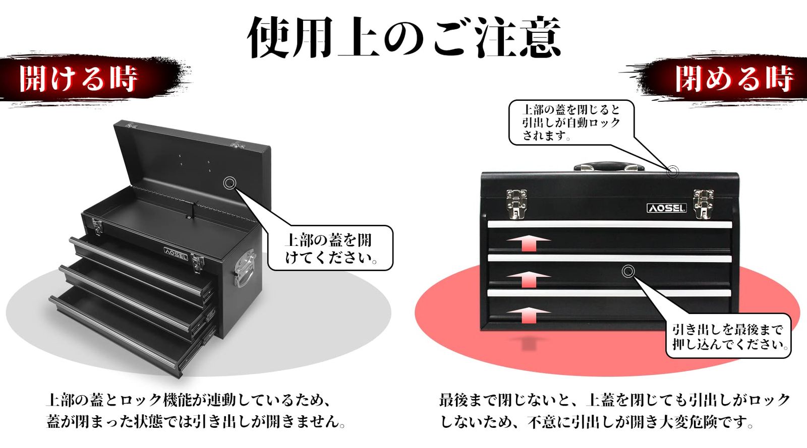 【収納・携帯便利】引き出しの数が多く、多種多様な工具を用途別に分類しながら保管できて収納力が高いです。トップカバーを閉じると引出しが自動ロック、飛び出し防止ロック機構付です。上部・側面ハンドル付きで、工具箱の持ち運びがしやすくなっています。