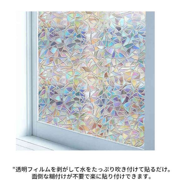 透明フィルムを剥がして水をたっぷり吹き付けて貼るだけ。面倒な糊付けが不要で楽に貼り付けできます。