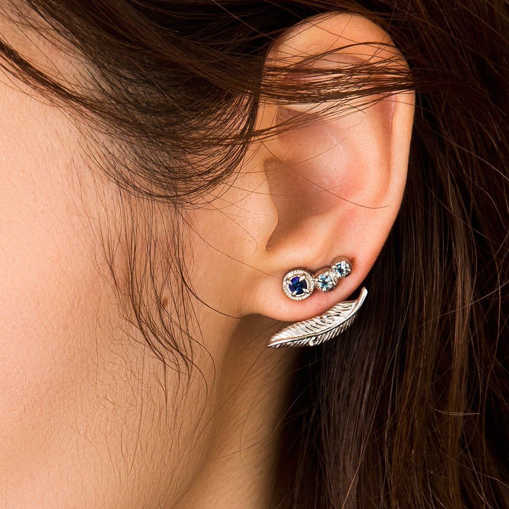 耳元に軽やかな翼を—。三連のスタッドに、耳たぶの下でそっと弧を描くフェザージャケットを合わせた2WAYピアスです。フロントには、虹色にきらめくブルーのミスティックトパーズ、澄んだブルートパーズ、柔らかなアクアマリンを並べ、青のグラデーションに深みを添えました。ジャケットはポストに差し込みキャッチで固定するだけ。耳の厚みに合わせて高さを微調整でき、単体のスタッドとしても洗練された表情に。フェザーは“飛躍・上昇”の象徴。小さな一片に前向きな力を宿します。地金はロジウムコーティングを施したシルバーで、変色しにくく清潔感のある艶をキープ。アトリエで一つひとつ成形・石留め・磨きを重ね、肌に触れる面まで滑らかに仕上げました。日常にも特別な夜にも、横顔をモードに引き上げる小さなアートピースです。※1個売り(片耳分)。