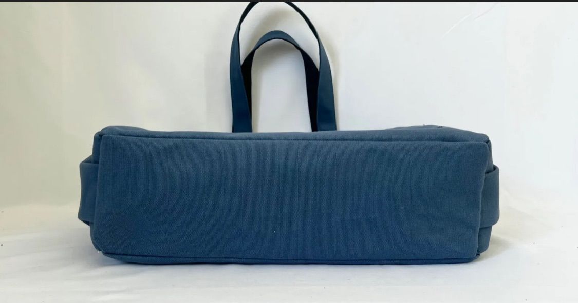 ハンドメイドの倉敷帆布さんの8号帆布のブルーグレー系の2色を組み合わせた大きめのサイドポケット付きトートバッグです。