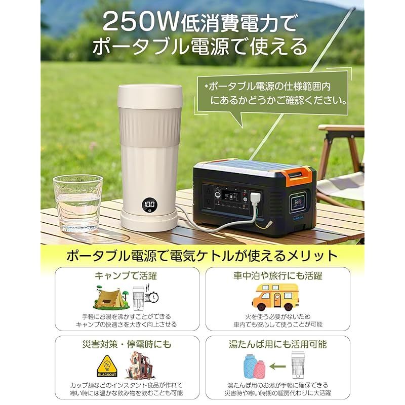 【250W低消費電力でポータブル電源に接続して使える】ポータブルケトルはわずか250Wの低消費電力で、ポータブル電源に接続してお湯が沸かせます。電気ケトルとポータブル電源の組み合わせは、キャンプやバーベキューなどのアウトドアレジャー、車中泊に最適であり、災害時や停電時にも役立ちます。火おこしの手間がないほか、素早くお湯を沸かせるため、時間と労力を節約できます。お湯を沸かす電気ポットとポータブル電源がセットであれば、こうした活用シーンの範囲が格段に広がり、自由度が高まります。※本製品はバッテリー内蔵製品ではありません。充電式ではありません。