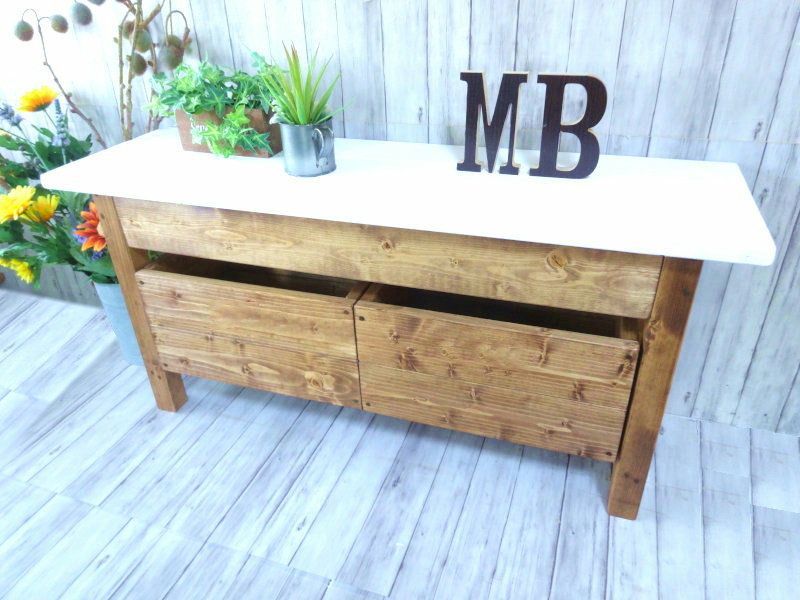 ハンドメイド 2人掛けベンチ 収納ボックス ホワイト✕チーク色