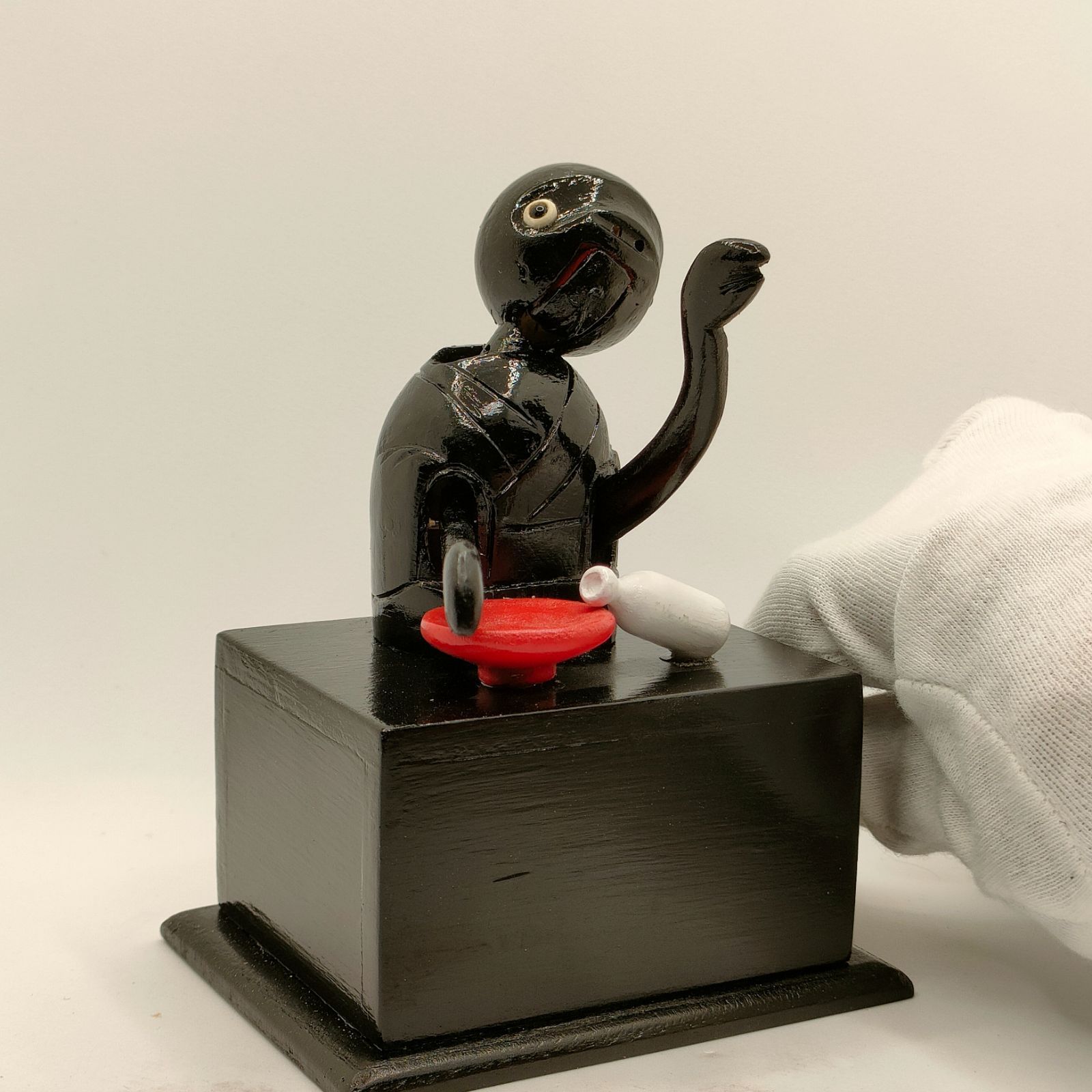 土台のつまみをくるくる回すと、首を右へ左へリズミカルに振りながら、大きな赤い口を開けて踊り出す愛らしい動き。