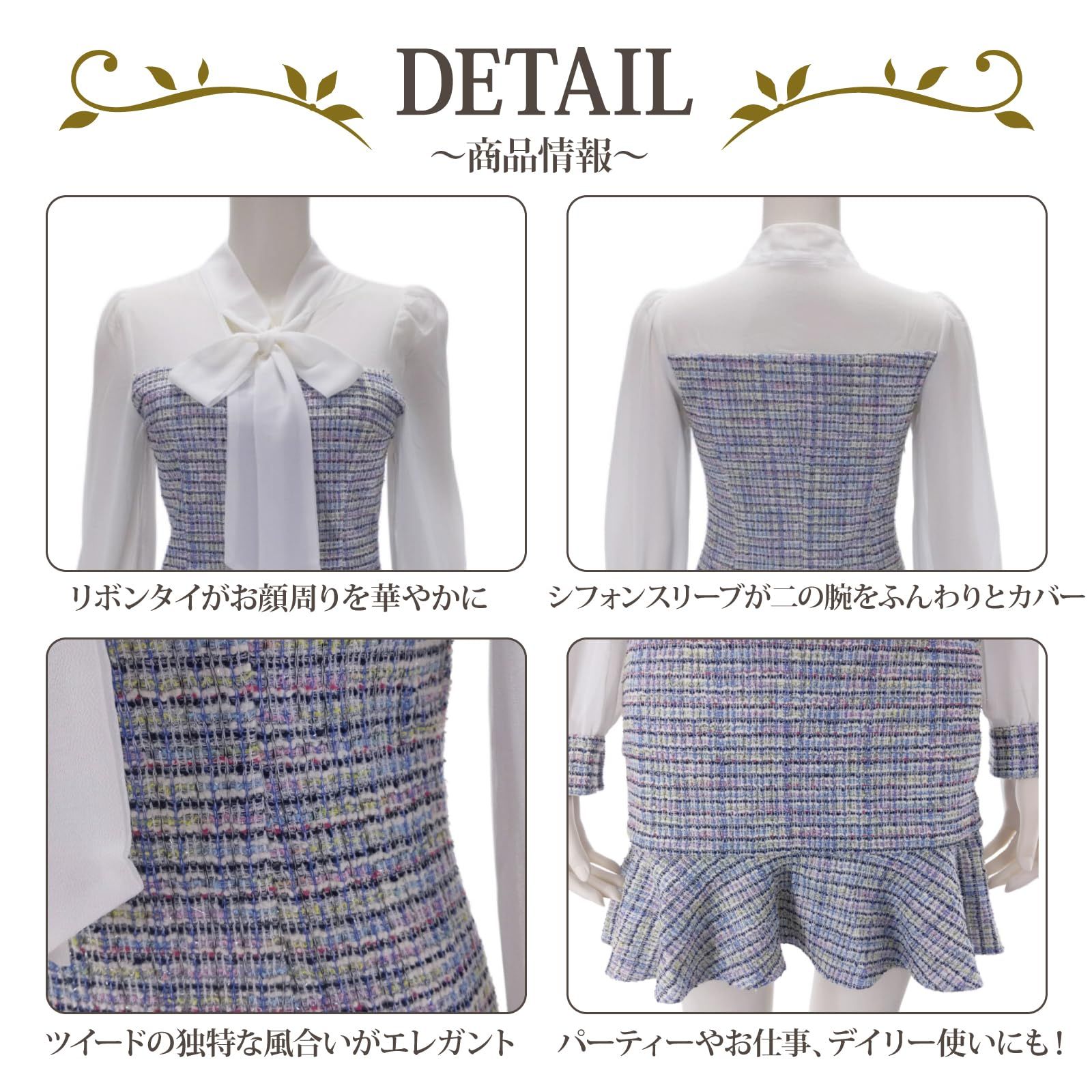 GRAXIA グラシア キャバドレス ミニドレス ツイード ワンピース キャバ嬢 キャバクラ ラウンジ 長袖 リボンタイ シフォン フリル レディース マルチ Lサイズ