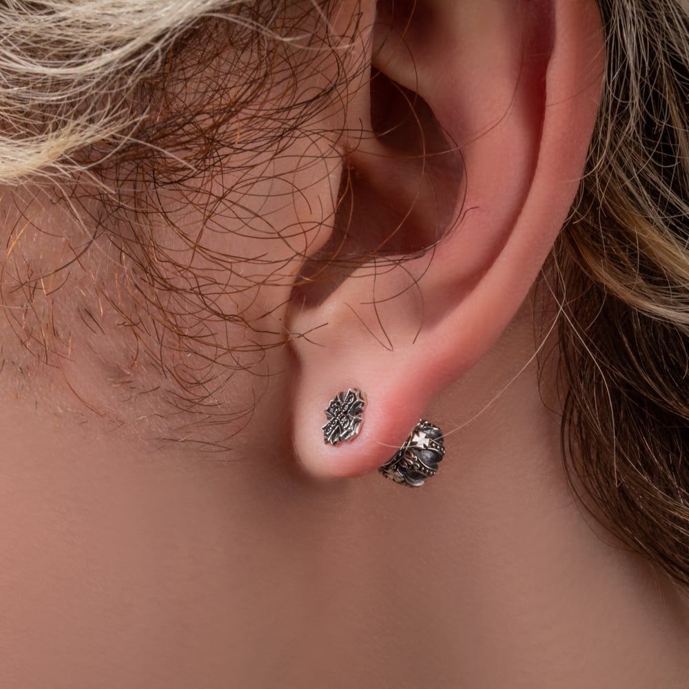 重厚な存在感を放つアイアンクロスのスタッドピアスは、ただのアクセサリーではなく、洗練されたアートピースのような仕上がりです。フロントには漆黒のCzブラックを敷き詰めたパヴェ仕様のクロスが煌めき、力強さとエレガンスを同時に表現。さらにキャッチ部分までもが緻密な王冠モチーフでデザインされており、360度どこから見ても造形美を楽しめる特別な一品です。SV925の質感を最大限に活かした立体的な彫刻は、ブランドの哲学を継承する提携アトリエ工房の熟練職人による丹念な手仕事から生まれています。ユニセックスで使えるバランス感と、スタイリングを選ばないサイズ感も魅力。耳元にさりげなく添えるだけで、クラシカルな荘厳さとモダンな個性を同時に演出してくれます。裏面には〈AK〉と〈925〉の刻印を施し、確かな品質とブランドの誇りを証明。