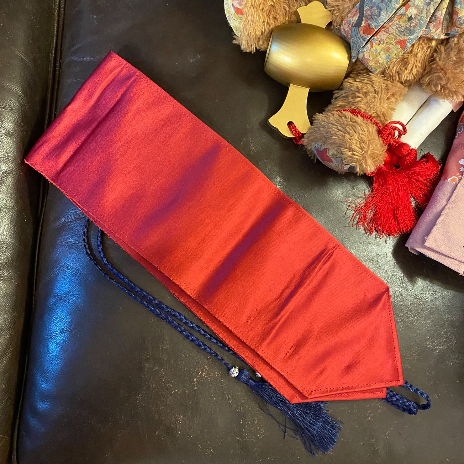 黒地に赤・黄・墨色の“にじみ絵”のような椿が咲く、レトロモダンな存在感。アンサンブル(着物+羽織)から仕立て直した一点物で、深紅の帯サッシュベルトと濃紺の房付き紐がウエストをきゅっと引き締める。ワンピース単体でもセットアップでも映えるから、ブーツやベレー合わせの街着はもちろん、撮影・舞台衣装にもおすすめ。和の気品とモード感を両立した、季節を問わず楽しめるリメイクセットです。