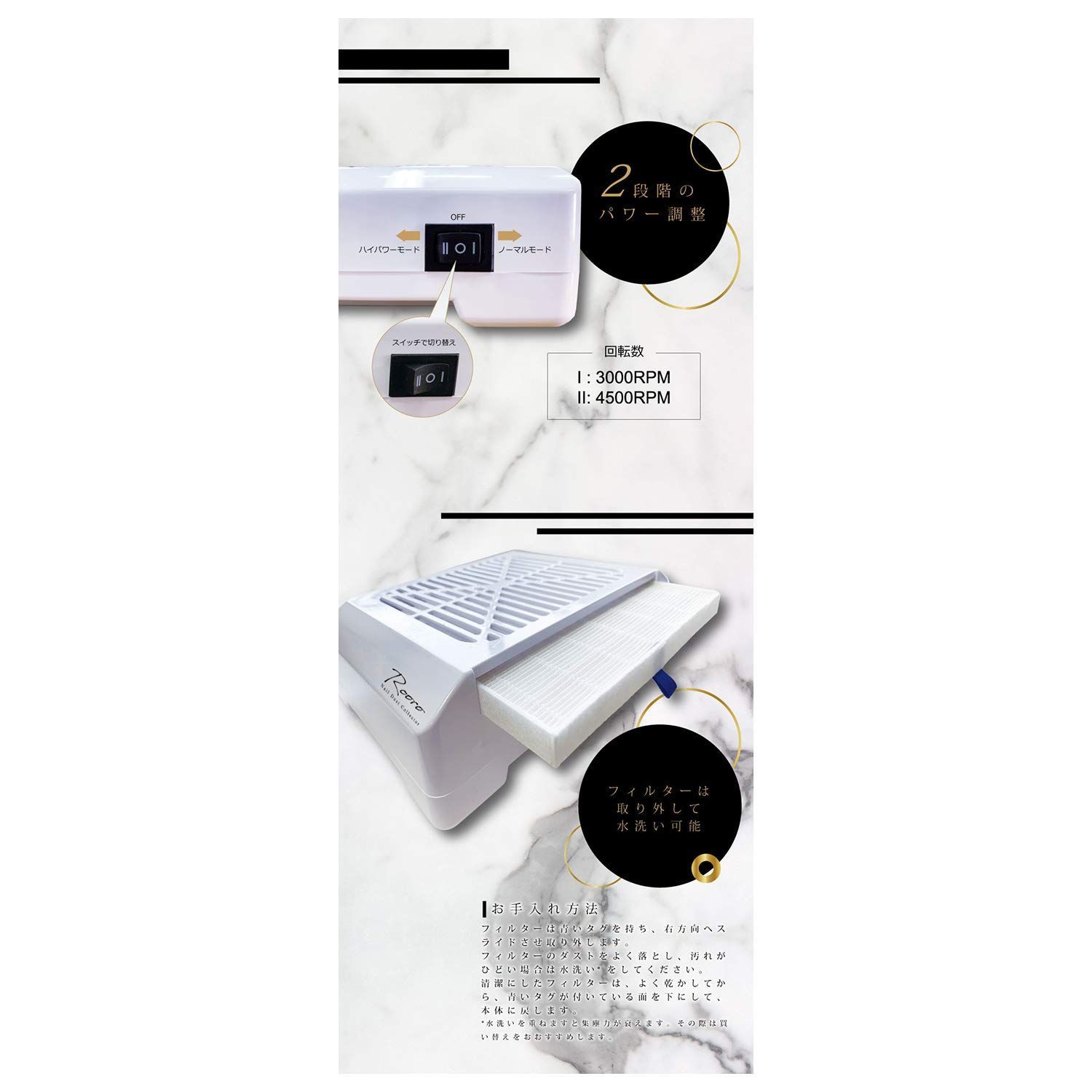 ・二段階でパワーの調節が可能で、ハイパワーモードでも音が気にならない静音設計