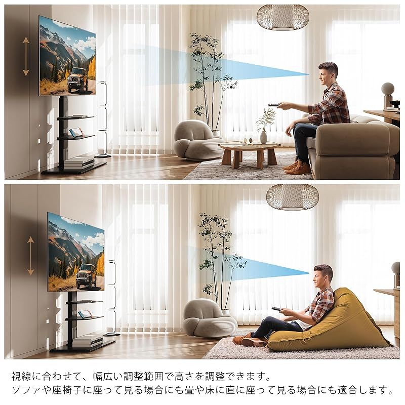 私たちはいつももっといい方式を探し、視聴をさらに快適、愉快にさせます。最初に単一の機能から、現代の生活方式と融合しているシステムのプランに演じるようになりました。いずれか材質の選択、構造のデザイン、及び外観造形の表現、全部に一番に根本的な信念にめぐり、機能性の製品を芸術の表現にさせます。FITUEYESは厳しい工芸の標準で、その信念を貫き、芸術家の目つきで、製品の細部を観察します。FITUEYESは全世界のユーザーに好まれる視聴のブランドであるのみならず、さらに未来を導く生活のスタイルでもあります。【VESA規格対応】汎用性の高いVESA規格(テレビ背面のネジ穴間の距離)対応、最小限は10×10cm、最大限は60×40cmです。当製品が32~65インチのテレビやモニターに適応します。【高さ調節可能】高さが支柱の取り付け位置により、7段階の高さ(1130mm~1430mm)を選択して取り付けることができます。【ラック角度調節可能】左右方向へ±30°回転することができ、また、ブラケットは前15°/後ろ5°で調整できるので、リビングルームだけでなく、キッチンや寝室に居ても、最適な調整角度で調整し、いろんな視角からの観賞を満たします。【安全素材・取付簡単】冷間圧延鉄素材、丈夫で耐震性もあり、テレビが倒れる心配がなく安心です。また、取付必要な部品が揃っていて、取扱説明書も付属され、取付は簡単です。【品質】お買い上げ日から5年間の品質をご提供いたします。ご使用中、この商品について、何かご問題点がございましたら、ぜひ、ご遠慮なくこちらにご連絡ください。24時間以内でご返信いたします、無料交換または全額返金などの対応します。
