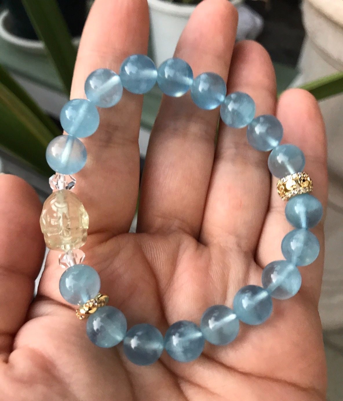 透明度の高い高品質リビアングラスのレアな手彫りガネーシャ神のビーズとアクアマリンのデザインブレスレットです。