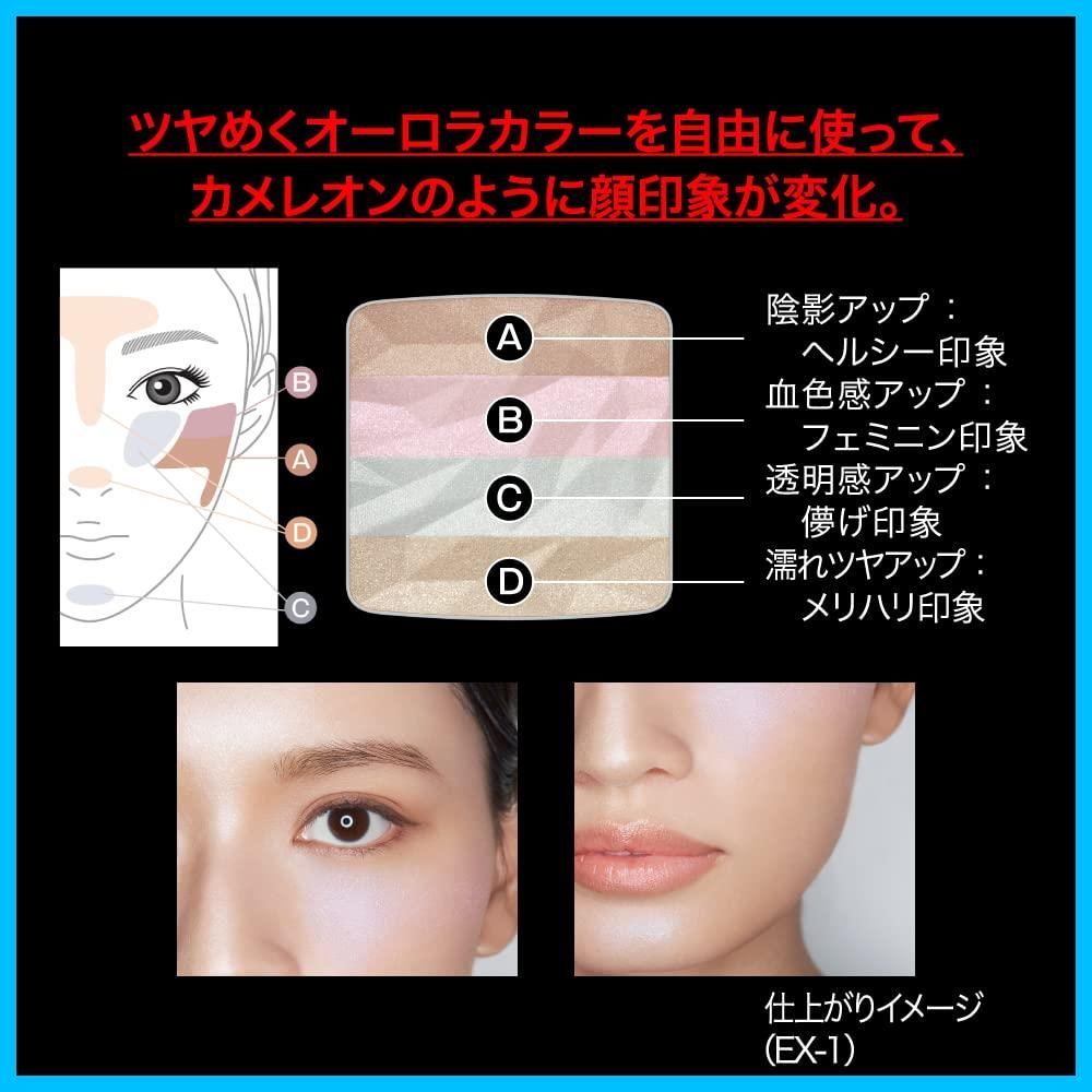 4色のツヤのあるオーロラカラーでなりたい顔印象、変幻自在。それぞれのパーツに色とツヤを足して立体感をつくるハイライト。■単色使いでなりたいニュアンスを演出したり、ブレンドして自分だけのカラーを楽しんだり、使い方はいろいろ。 ■ボディにも使用可能でパーツの立体感を強調。■全2種 EXー1:ブルー系 EXー2:ピンク系