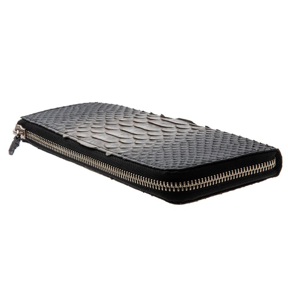 A slim long wallet cut from genuine snake python, finished in a refined grey-to-black gradient that highlights the leather’s raised scales. The surface has a subtle embossed depth and a supple hand that almost clings to your palm. A smart L-shaped zipper opens wide so bills and coins are easy to access in one motion. Inside, the layout is clean and decisive—everything stays organized without bulk. Though slender, it slips smoothly into an inner jacket pocket and carries more than it looks. Each piece is carefully cut, skived, stitched, and edge-polished in our atelier for a smooth, durable finish. A city-ready wallet that blends function with quiet luxury.
