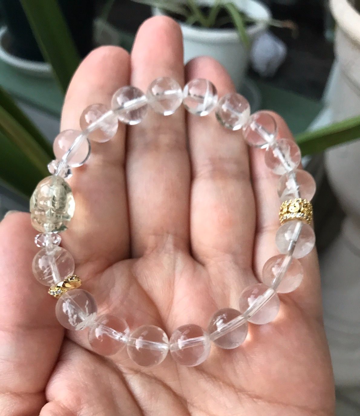 透明度の高い高品質リビアングラスのレアな手彫りガネーシャ神のビーズとセリサイトインスターローズクォーツのデザインブレスレットです。