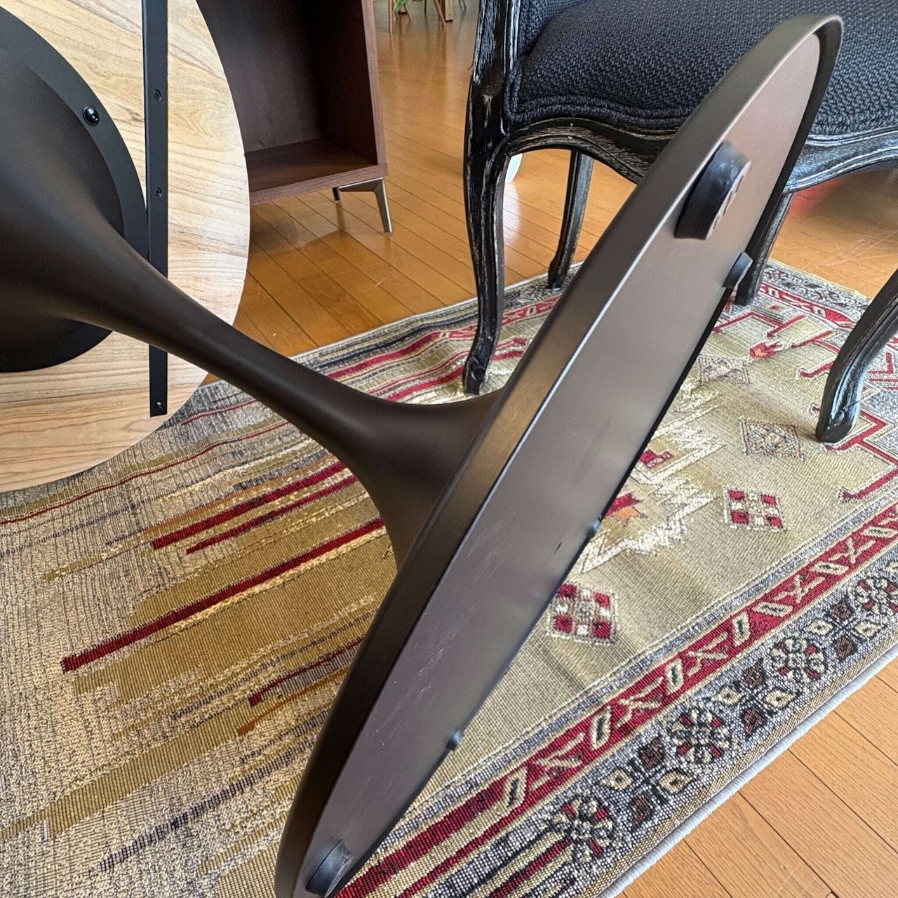 脚部には空間に抜け感をプラスするチューリップ型のスチール製ベースを採用しました。デザイナーズ家具にも見られるこの特徴的なデザインはテーブル全体に軽やかで洗練された印象を与えます。マットな質感の粉体塗装が天板のナチュラルな風合いと美しいコントラストを生み出し、モダンな雰囲気を高めます。また、中央1本脚なのでチェアの配置も自由自在。足元がすっきりとしておりお部屋を広く見せる効果も期待できます。