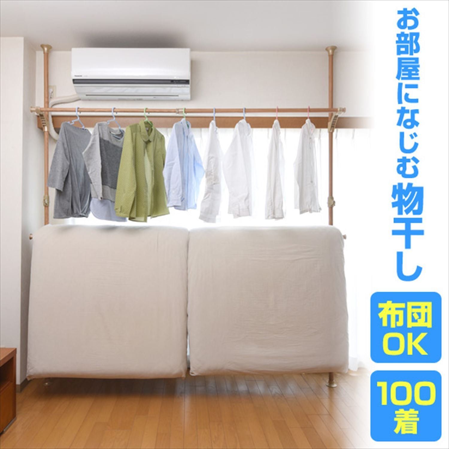 ●日当たりの良い窓際でも、エアコン下でも、壁面にも、設置場所を柔軟に決められる突っ張り固定式の室内物干し