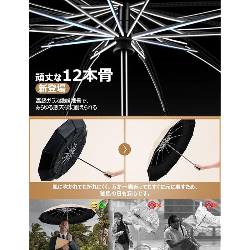 強風でも壊れにくい【12本超強靭な骨組みで強化型傘】?? 様々な意見をまとめて、弊社新作の晴雨兼用傘ががようやく登場!柔軟性と強度を併せ持つ12本親骨を採用し、普通の8傘本骨より、耐風性と耐久性ともに向上させた、防食加工が施された傘のフレームは超強靭で錆びにくい上に、強風にあおられても豪雨に打たれても折れたり曲がったりしにくいです。3段折り構造により、強風で裏返ってもちゃんと元に戻ります。安易に折れたり曲がったりする心配ありません。梅雨はもちろん、豪雨、強風にも安心できます。男性の方が求める機能を全て取り入れた究極のメンズ傘です。(※通常の傘より少し重いですが、機能を重んじて傘の強度と大きさを求めて作られています。重さに気になる方は何卒ご理解のほどよろしくお願い致します。)