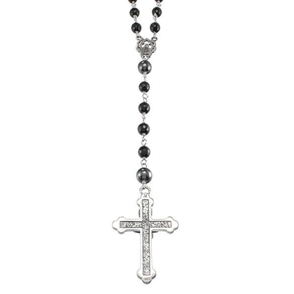This refined rosary necklace pairs a high-relief Madonna medallion with a sculptural crucifix, bringing a quiet, contemplative presence to the neckline. Alternating faceted onyx and metallic hematite beads shift with the light to draw deep, graphic shadows. The weight is reassuring yet easy to wear, and the clean facets keep the silhouette modern—equally at home with a tee and sweats or a crisp shirt and jacket, worn solo or as the anchor in a layered look. Both medallion and cross are cut in precise planes for a minimal, dignified profile. Crafted from sterling silver with a hand-applied oxidized finish, and completed under brand supervision at our partner atelier, it channels true savoir-faire. Finished with brand marks and quality hallmarks, and presented in a dedicated box—an artful piece for gifting or for your own ritual.