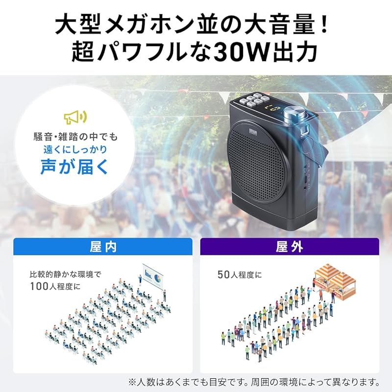 サンワダイレクト 拡声器 ハンズフリー ワイヤレス 有線マイク 高出力30 W 小型 ポータブル拡声器 ハンズフリー拡声器 400-SP 115 1