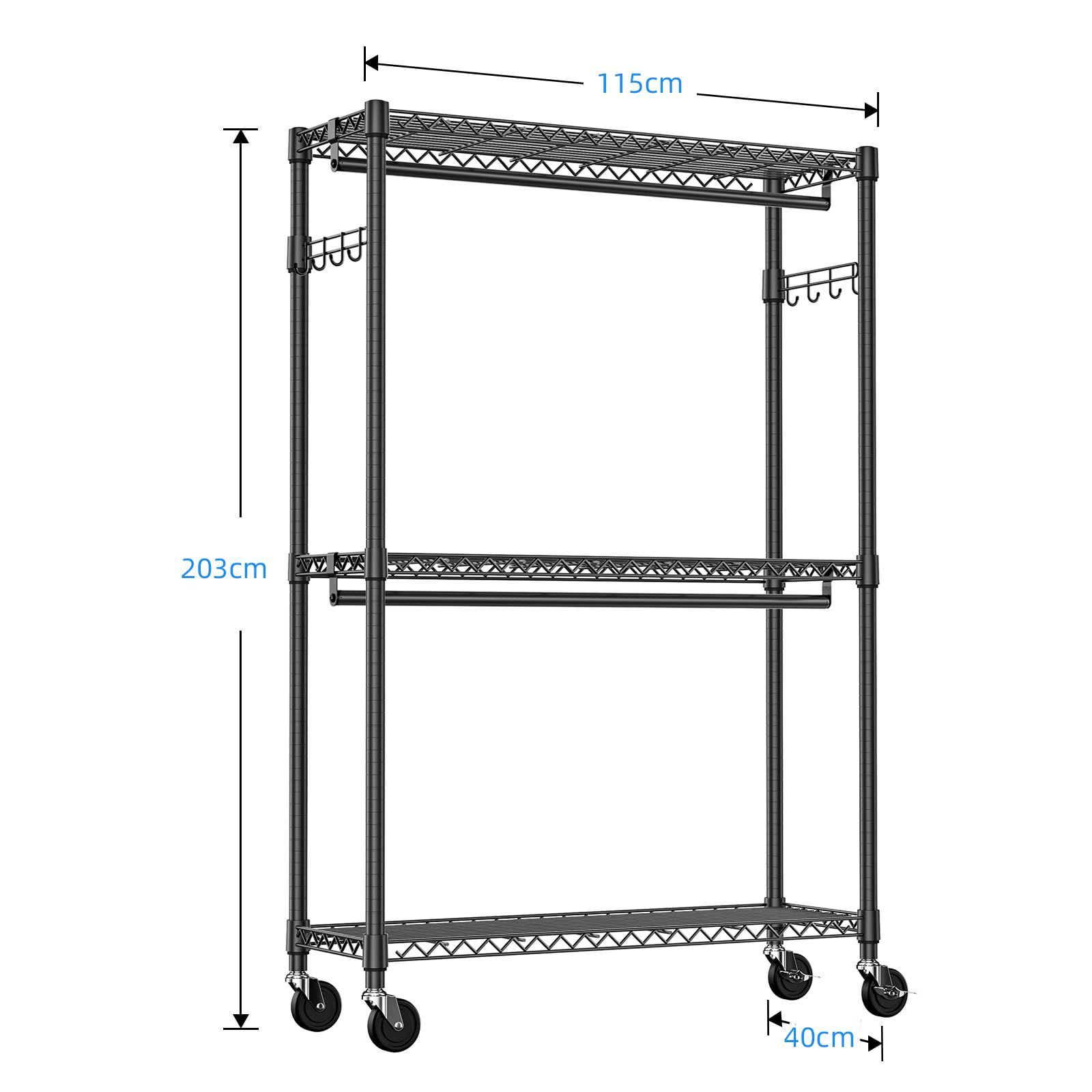 ワイヤー衣類ラック 衣類ラック 頑丈 耐久性 金属製自立式 高耐荷重 ラック 防錆 ハンガー クローゼットワードローブ ダブル 車輪付 アジャスター付属 突っ張りポールハンガー 工具付属 収納 幅115×奥行40×高さ202 cm 車