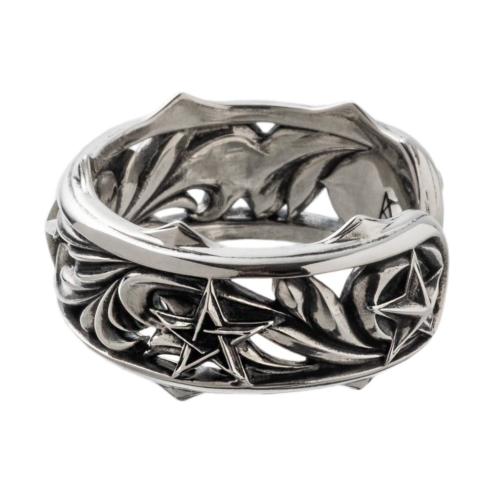夜空に瞬く星を、指先に映し込んだかのようなリング。カフ式のフリーサイズデザインは、手元にしなやかに寄り添い、どの指にも美しく馴染みます。ベースに繊細な唐草を彫り込み、その上に象徴的なスターと五芒星を重ね、さらにエンド部分にはアルテミスキングスを象徴する王冠を刻印。伝統的な意匠に現代的なエッジを融合させたデザインは、単なるアクセサリーではなく、まさにアートピースの風格を纏います。希望を象徴する星のモチーフは、身に着ける人の未来を照らし、日常に確かな輝きを添えてくれるでしょう。熟練の職人がブランド監修のもと、提携アトリエ工房にて一点一点丹念に仕立て上げたサヴォワフェール(職人技)。精巧な造形と程よいボリューム感は、長時間の装着でも快適な着け心地を約束します。9号から展開されるサイズはペアリングとしてもおすすめ。高貴さとモダンな洗練が同居するこのリングは、身に着ける人をより自由で強く、美しく引き立てる存在となるでしょう。