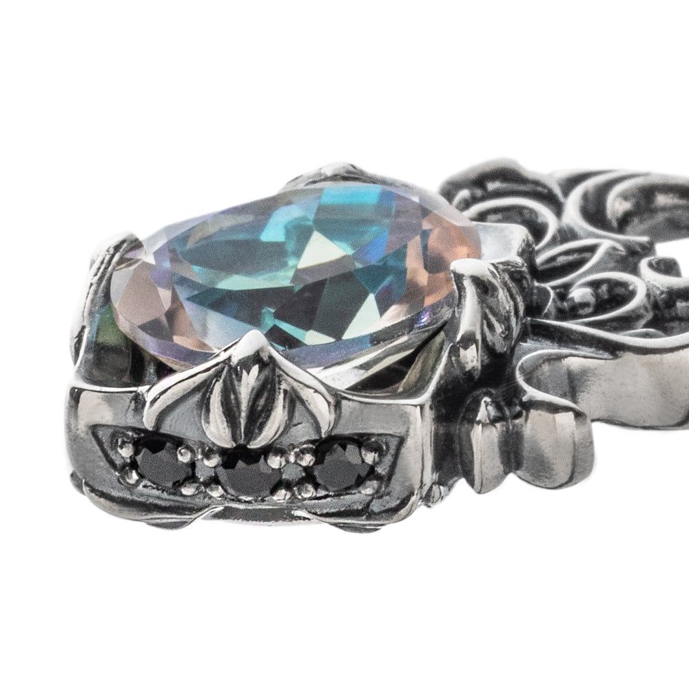 Grace the neckline with a pendant that carries the glow of a rainbow. At its heart is a mystic quartz—transparent yet alive with shifting greens and violets that catch the light from every angle. The stone is embraced by an ornate relief frame, while the bail is finished with a refined cross detail for a poised, architectural look. Along the sides, pavé-set black cubic zirconia deepen the contrast, letting polished silver and soft antiquing play in rhythm. A tracery cut-out on the back invites light through the gem, adding air and dimensionality.