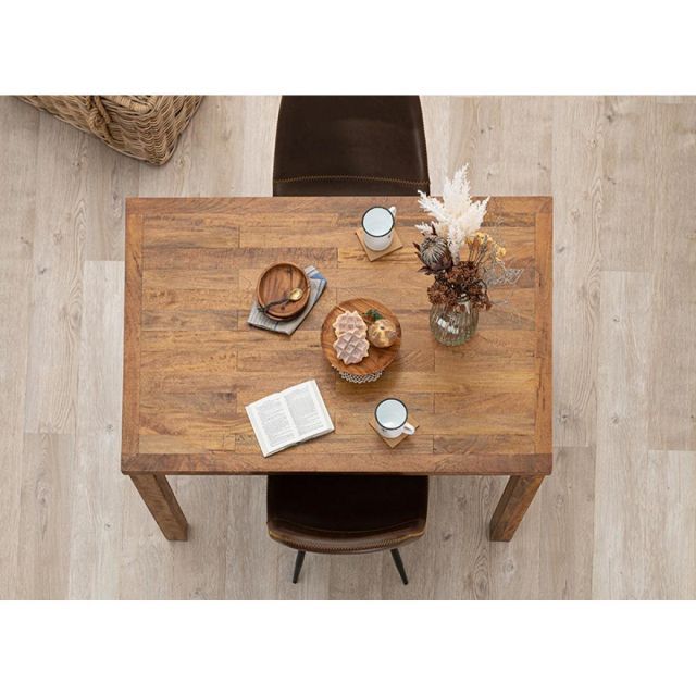天然木のマンゴーウッドを贅沢に使用した重厚感あるテーブルと本革を再現したおしゃれなチェアを合わせたダイニングセット。