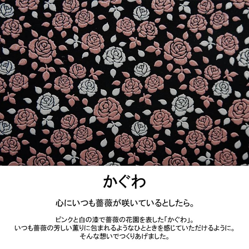 ブランド印伝『かぐわ』は、レギュラー柄のローズを2色の漆で漆付けした柄です。漆付けの作業は1色の漆を付けたら、漆が乾くまでもう1色を付けることができないため、2色の印伝は普通の印伝の2倍の時間と手間がかかっています。ピンクと白の組み合わせは可愛らしさと印伝特有の大人らしさがあり、上品な仕上がりです。