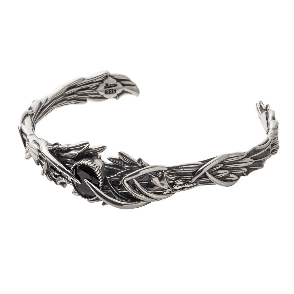 A sculptural cuff that layers opposing angel and demon wings in graduated tiers. Each feather is finely carved, with mirror-polished ridges and oxidized recesses to draw out dramatic shadows. At the center, a claw-like motif cradles a glossy black cubic zirconia for a bold focal point. The underside is fully detailed, and the flowing silhouette hugs the wrist with lively movement. Substantial yet smooth on the skin. Free-size; can be gently adjusted for a personalized fit. Pairs powerfully on its own or with other pieces from the Demon series. Inside are the brand and 925 hallmarks—wear the symbolism of ascent and elevation every day.